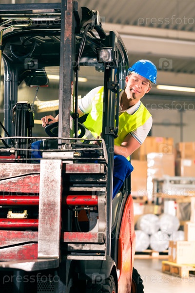 Водитель погрузчика в защитном жилете на складе транспортно-экспедиционной компании