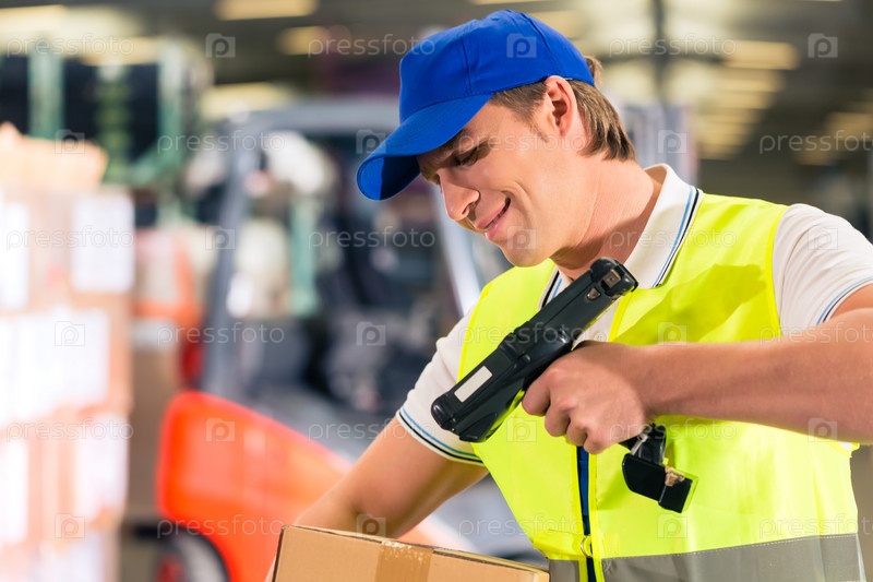 Работник сканирует штрих-код с коробки на складе транспортно-экспедиционной компании