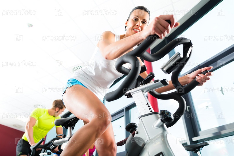 Группа молодых людей занимаются спортом на тренажерах в зале