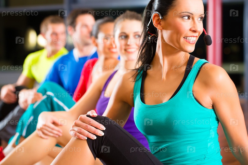 Группа людей и инструктор в тренажерном зале