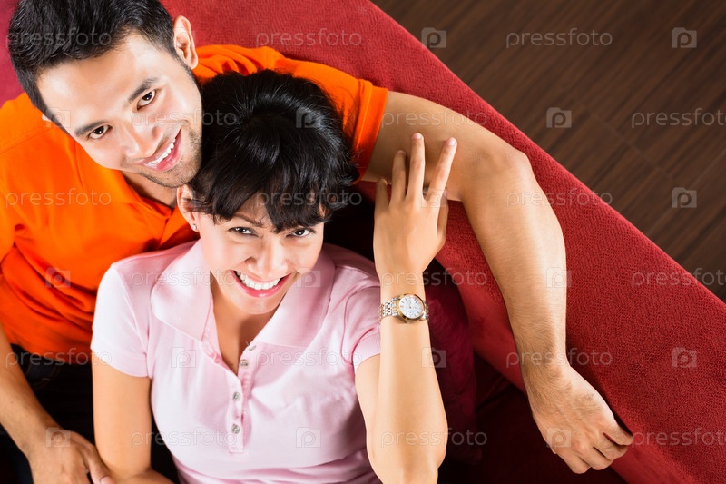 Индонезийская пара сидит на уютном диване дома