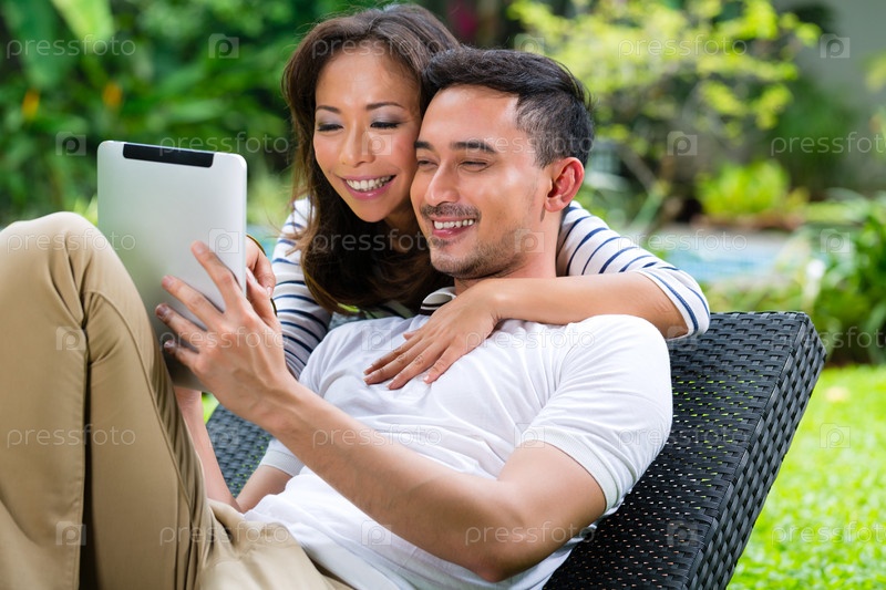 Азиатская пара в саду с планшетом