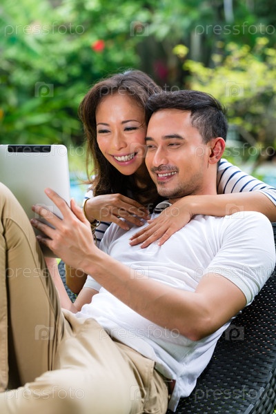 Азиатская пара в саду с планшетом