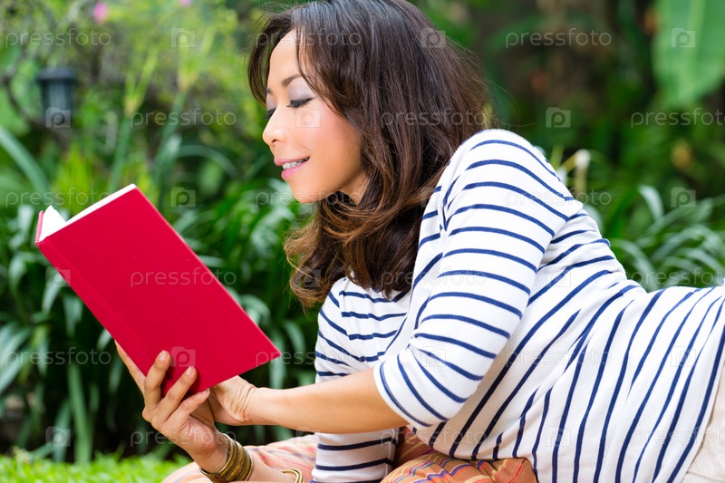Молодая азиатская женщина читает у себя дома в саду