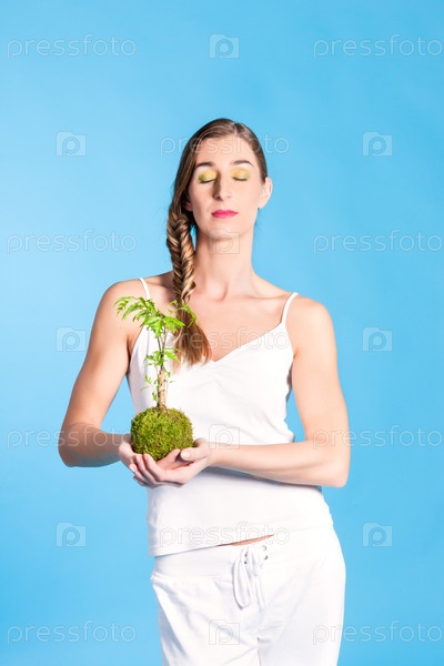 Молодая женщина держит небольшое дерево