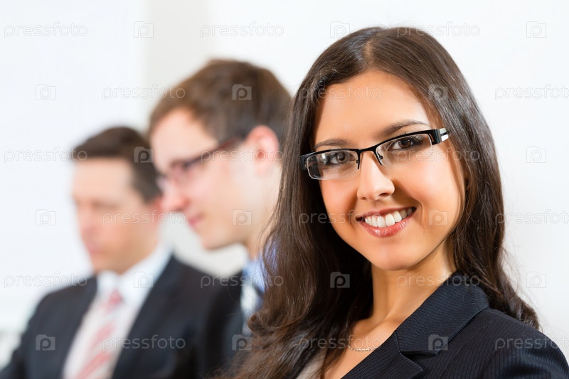 Группа деловых людей в офисе, женщина смотрит в камеру