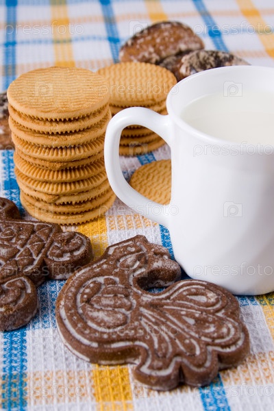 Кружка молока с пряниками и печеньем на клетчатой салфетке