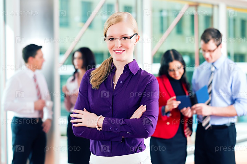 Деловые люди в офисе. Женщина смотрит в камеру