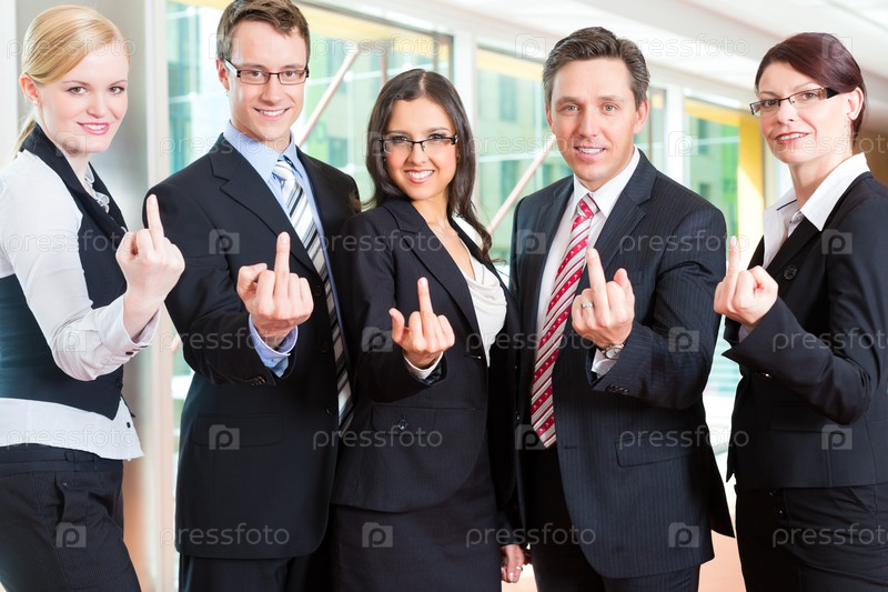 Группа бизнесменов позирует и показывает пальцы