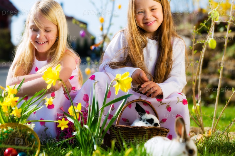 Девочки с пасхальными яйцами и кроликами