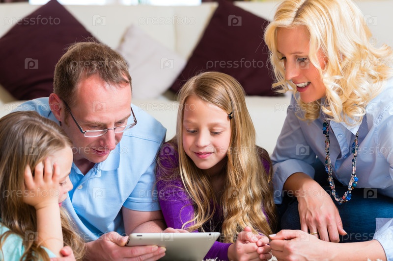 Семья из матери, отца и дочерей играют на полу с планшетным компьютером