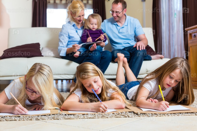 Семья из матери, отца и дочерей рисуют на полу