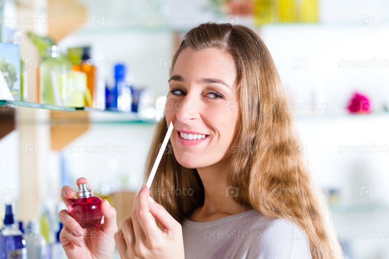 Молодая женщина тестирует духи в парфюмерном магазине