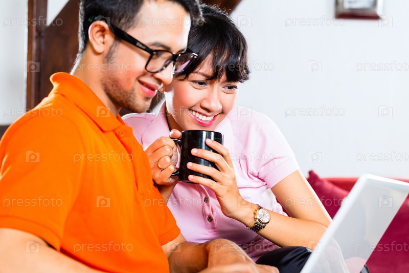 Азиатская пара на диване с ноутбуком