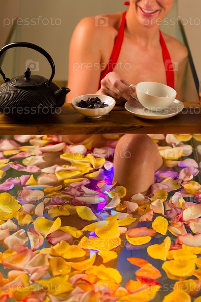 Женщина в спа-салоне в ванне с лепестками цветов пьет чай