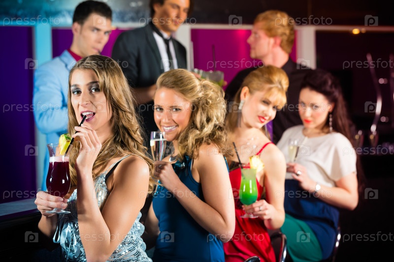 Группа молодых людей в клубе или баре с коктейлями