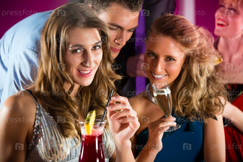 Молодые люди в клубе или баре пьют коктейли и веселятся