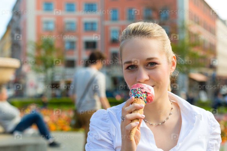 Молодая женщина ест мороженое в рожке в парке