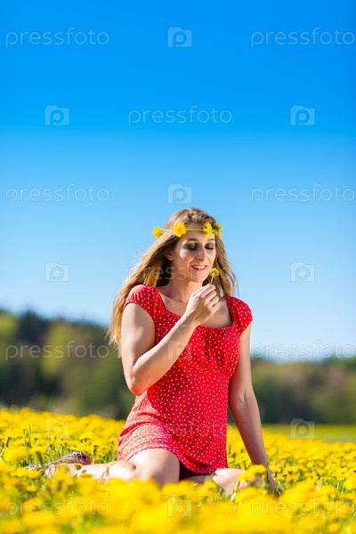 Девушка в венке на весеннем лугу одуванчиков