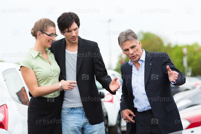 Зрелый мужчина и молодая пара на автостоянке салона перед автомобилями