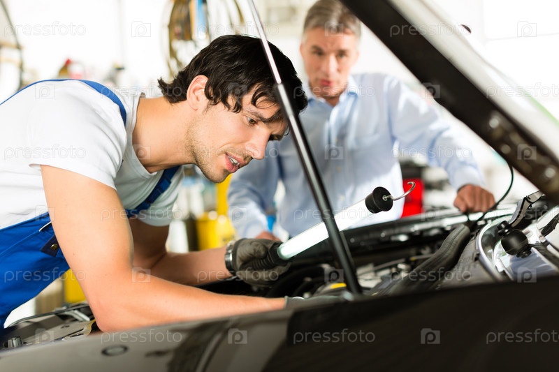 Зрелый мужчина и автомеханик смотрит под капот автомобиля