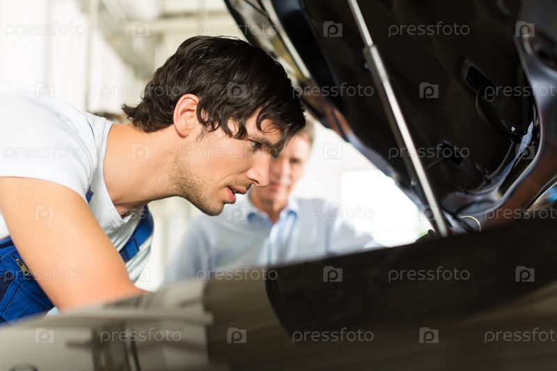 Зрелый мужчина и автомеханик смотрит под капот автомобиля