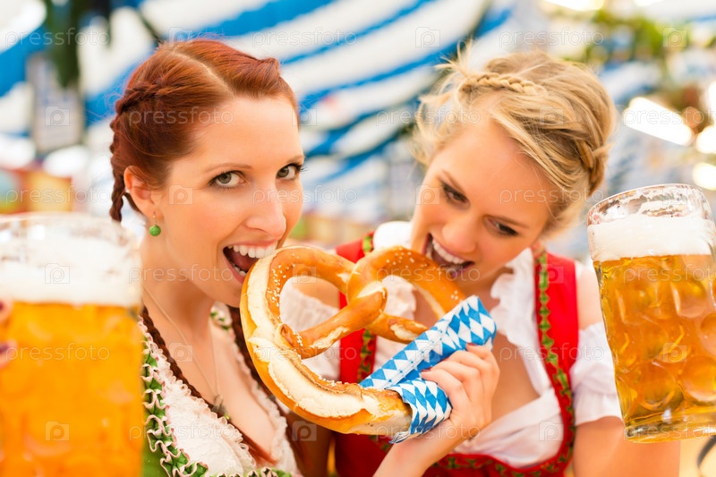 Молодые женщины в традиционной баварской одежде с пивом и кренделем на Октоберфест