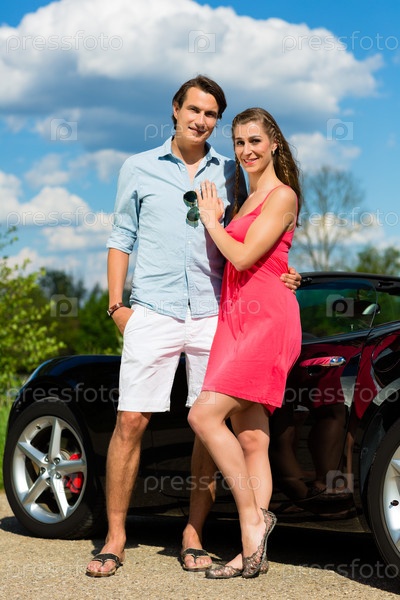 Молодая пара на фоне кабриолета в летний день