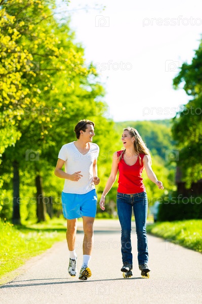 Девушка на роликах и молодой человек на пробежке в летний день