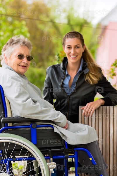 Молодая женщина с бабушкой в инвалидной коляске на прогулке