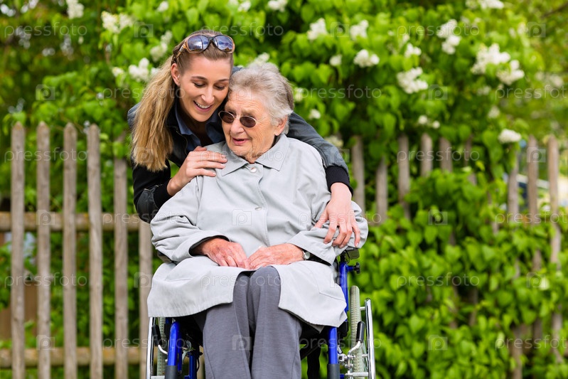 Молодая женщина с бабушкой в инвалидной коляске на прогулке