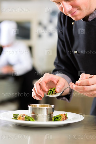 Шеф-повар в гостинице или ресторане готовит завершает блюдо