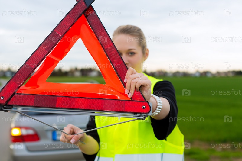 Молодая женщина с треугольником предупреждает о поломке автомобиля