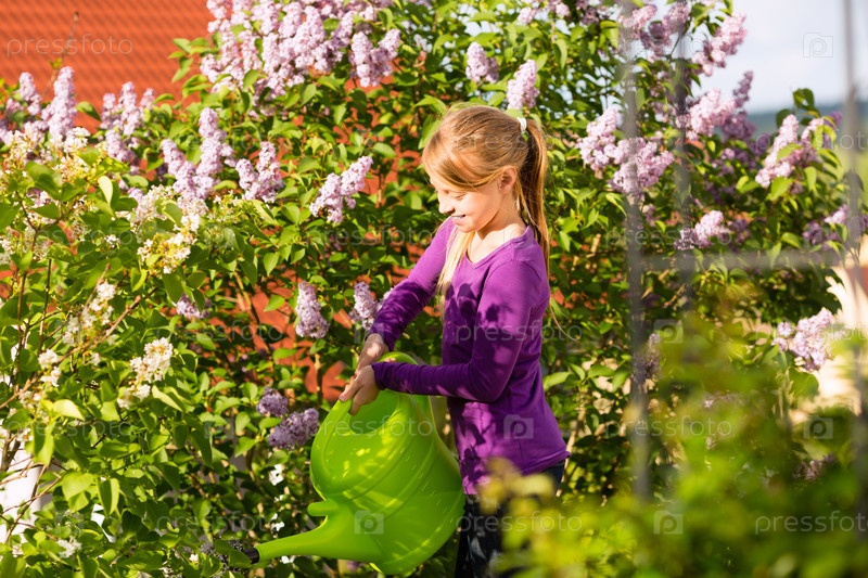 Счастливый ребенок поливает цветы в саду