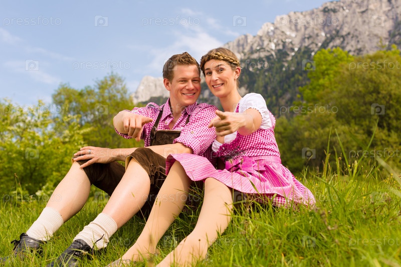 Счастливая пара в традиционных костюмах гуляет на лугу с видом на горы