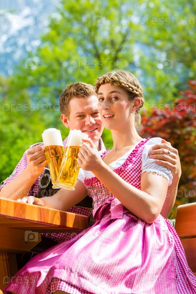 Счастливая пара с бокалами пива в саду