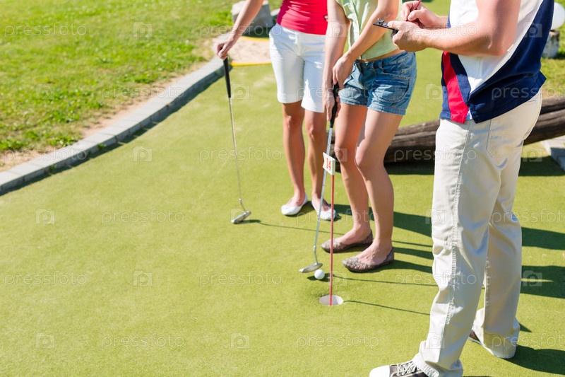 Мужчины и женщины играют в мини-гольф в прекрасный летний день