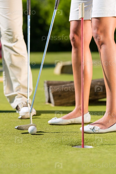 Мужчины и женщины играют в мини-гольф в прекрасный летний день