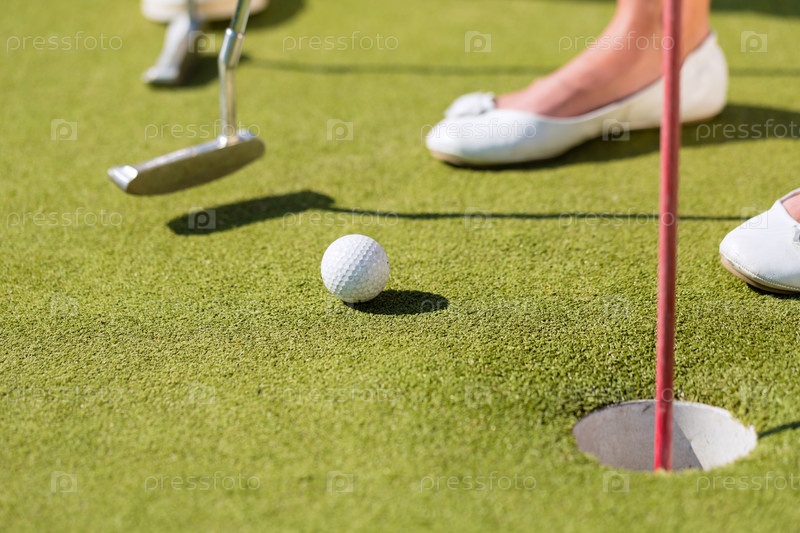 Мужчины и женщины играют в мини-гольф в прекрасный летний день