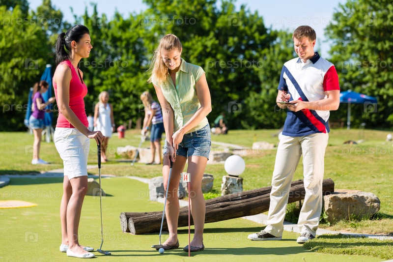 Мужчины и женщины играют в мини-гольф в прекрасный летний день