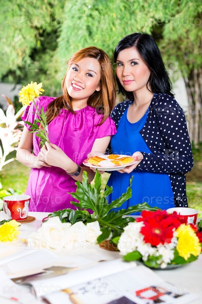 Две азиатские подружки с цветами