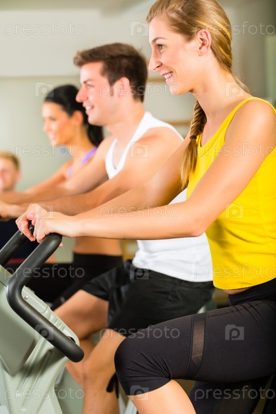 Группа мужчин и женщин на тренажерах в зале