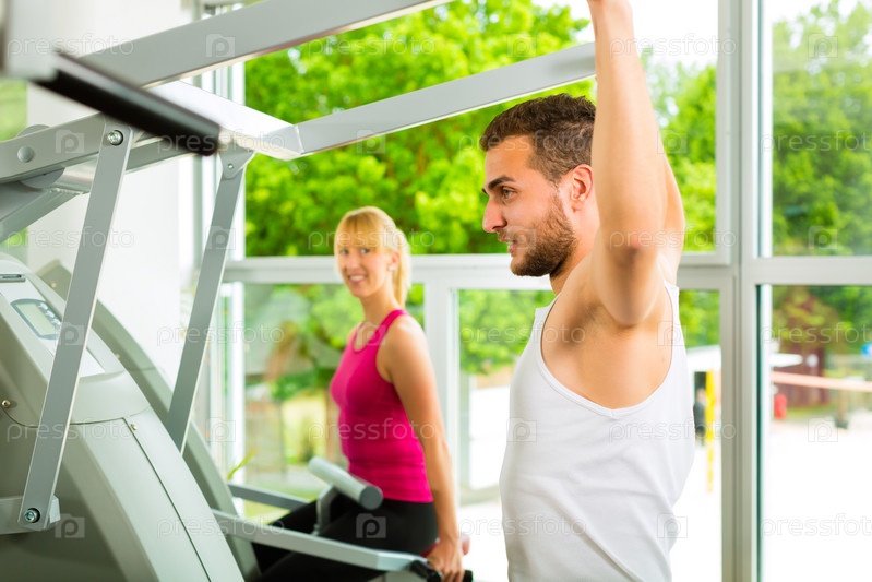 Группа мужчин и женщин на тренажерах в зале