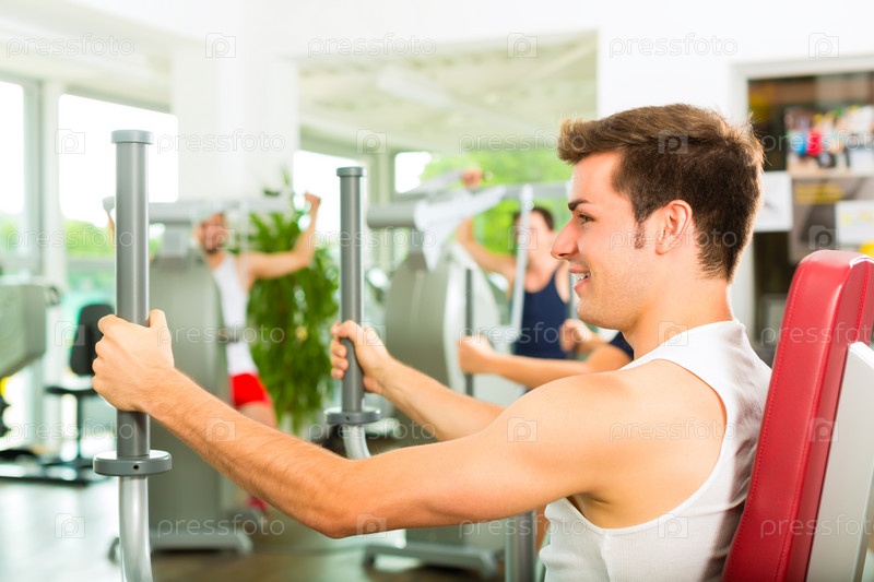 Группа мужчин на тренажерах в зале
