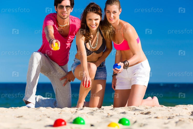 Группа молодых людей играет в петанк на открытом воздухе
