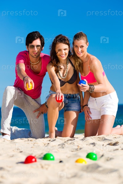 Группа молодых людей играет в петанк на открытом воздухе