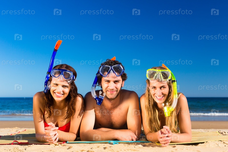 Друзья в масках с трубками на пляже