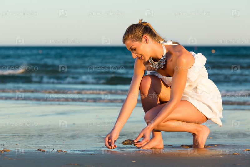 Женщин ищет морские раковины на пляже