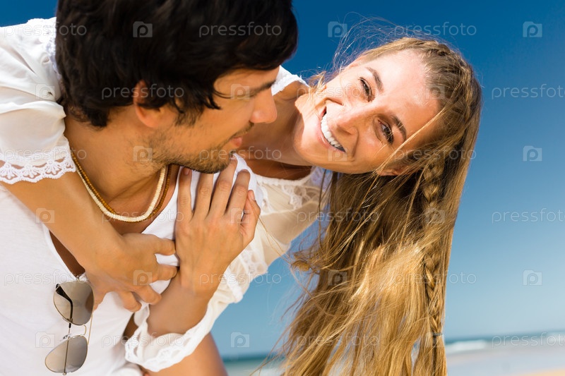 Игривая пара на берегу океана наслаждается летним отдыхом