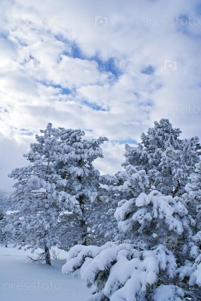 Прекрасный зимний пейзаж с соснами после снежной бури